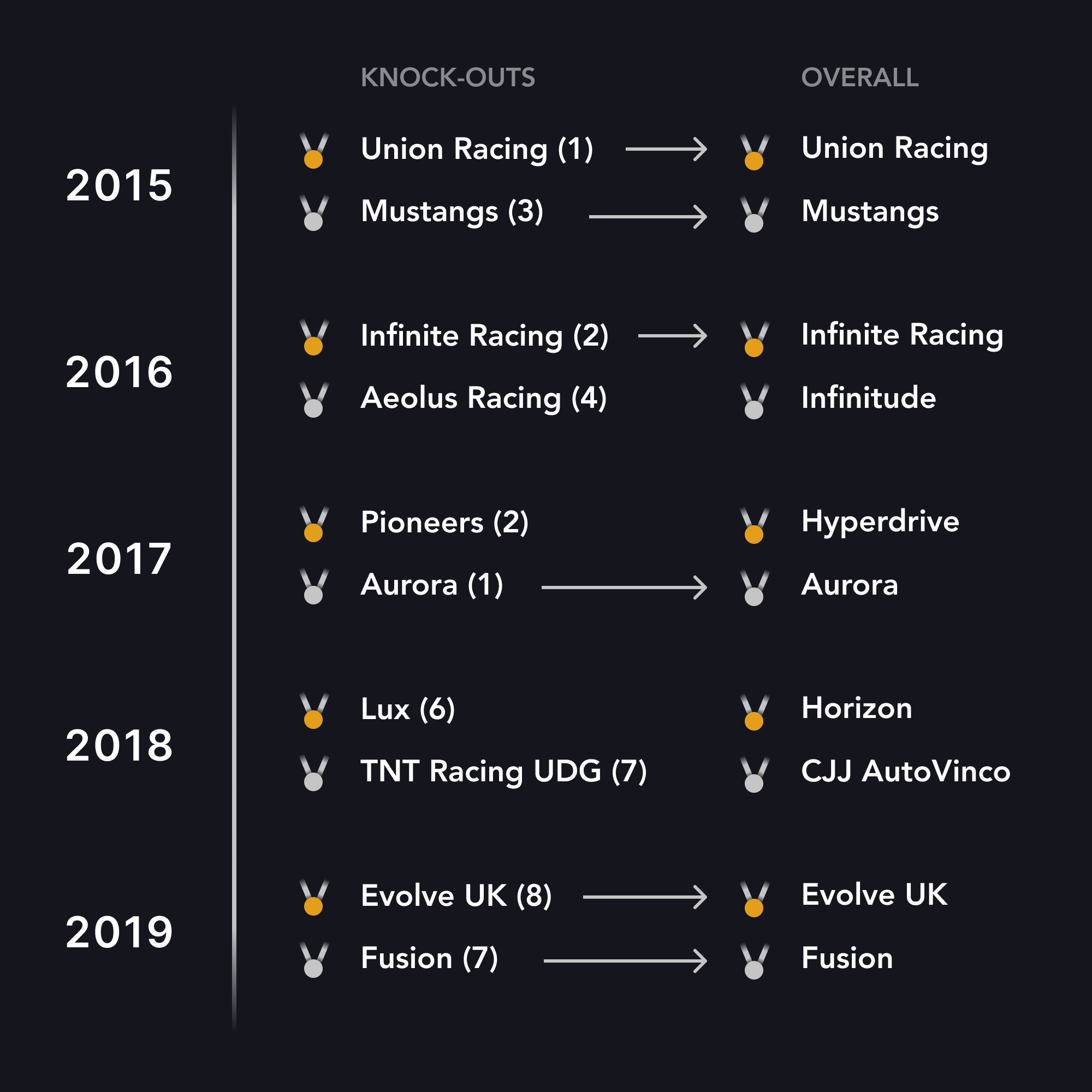 These teams were Union Racing in 2015, Infinite Racing in 2016 and Evolve UK in 2019 and it's not just first place that knock-outs predict well. In the same time period from 2015 to 2019, the runners up in knock-outs three times went on to come second overall: Mustangs in 2015, Aurora in 2017 and Fusion in 2019. The winners of the 2017 knock-out, Pioneers, went on to stand on the third step of the podium.